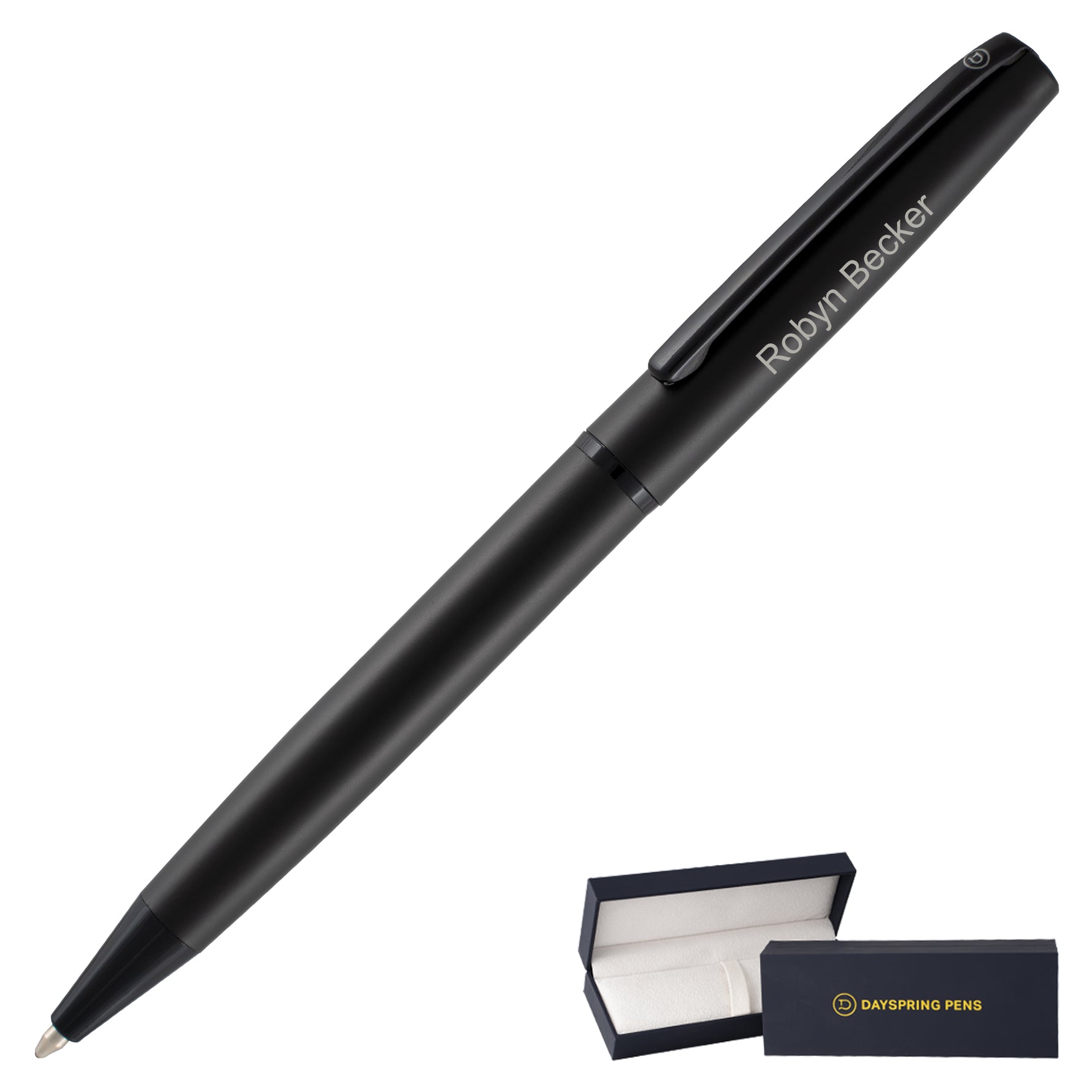 Your Richmond arrives protected in a premium black Dayspring Pens gift box, ready for immediate presentation. The laser engraving process reveals silver-toned text that contrasts beautifully against the matte finish, creating a professional appearance perfect for both executive gifts and graduation pen presentations.