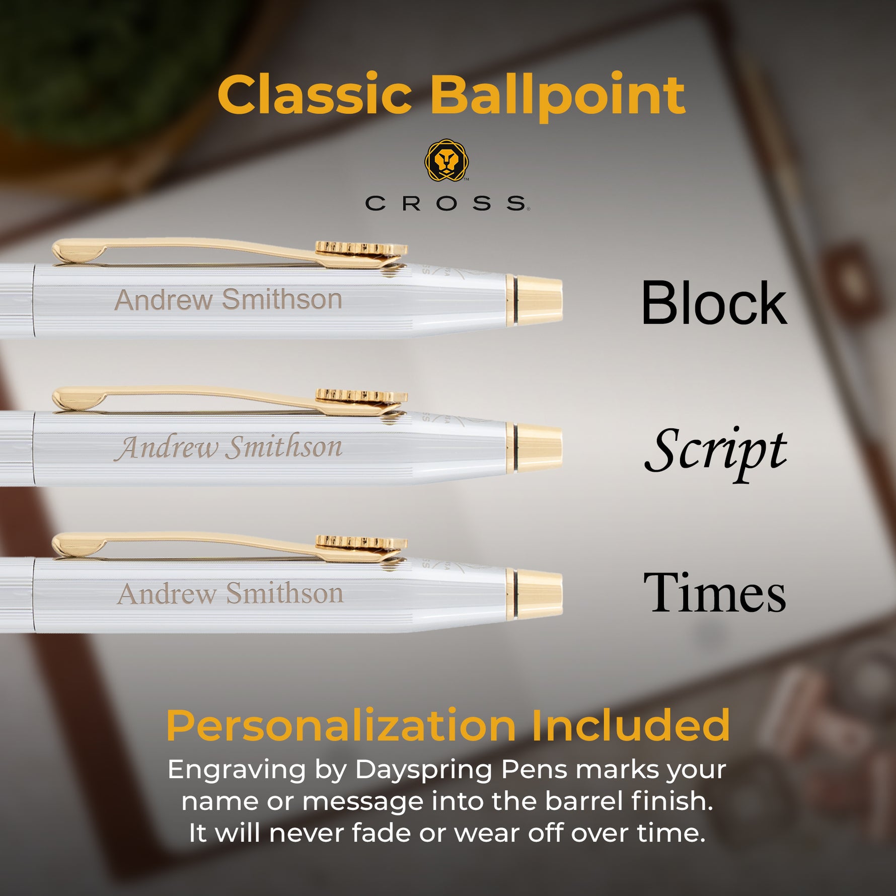 Once your order is placed, we select your pen, align it, and start engraving. Engraving is a permanent personalization that does not wear off or fade.