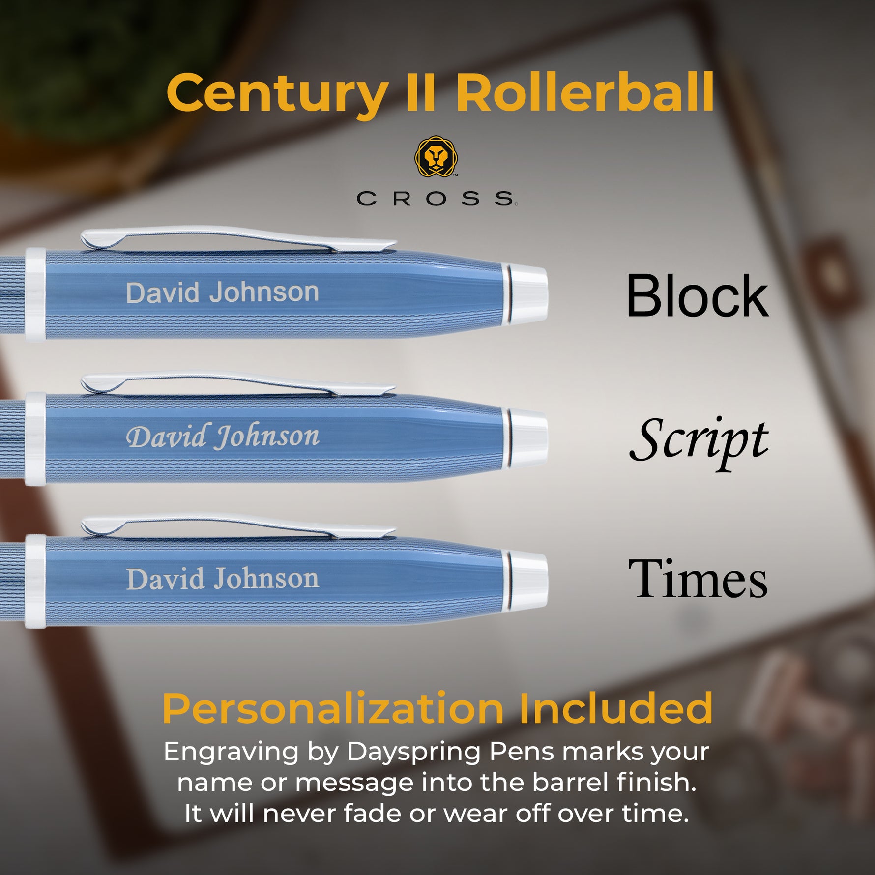 Once your order is placed, we select your pen, align it, and start engraving. Engraving is a permanent personalization that does not wear off or fade.
