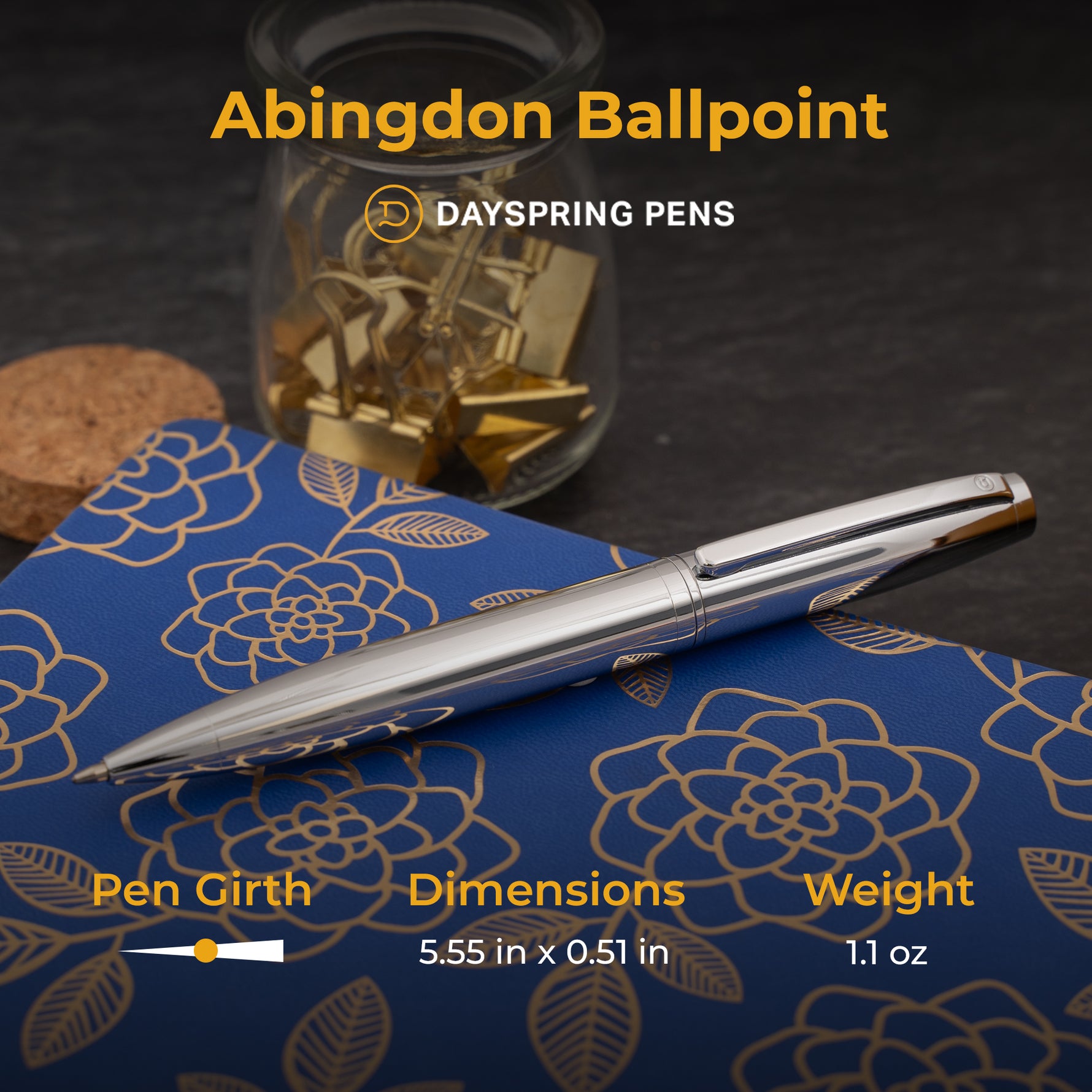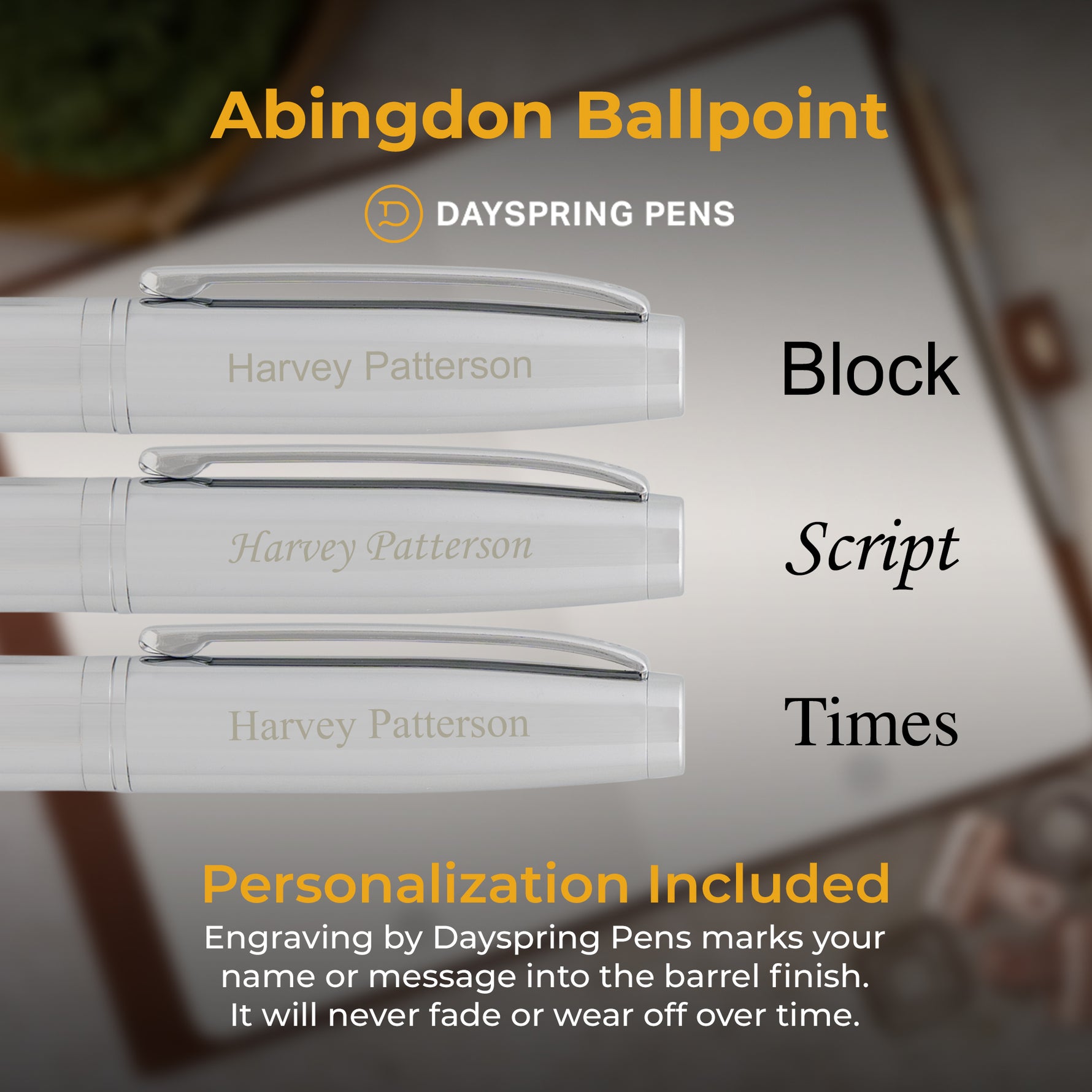 Measuring slightly larger than standard pens, the Abingdon offers generous engraving space on its highly-polished chrome barrel, where text appears in a contrasting light brass tone that stands out beautifully against the reflective surface. The pen accepts standard Cross-style refills available at most office supply stores, while its all-metal construction withstands daily use in briefcases, desk drawers, or jacket pockets without showing wear.