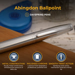 The Abingdon Chrome Ballpoint features a substantial cigar-shaped body with a tapered profile that sits perfectly balanced in your hand. Its precision-engineered twist mechanism advances the ballpoint with a smooth quarter-turn, deploying a medium-point black ink cartridge that writes consistently across standard paper types without skipping or bleeding.