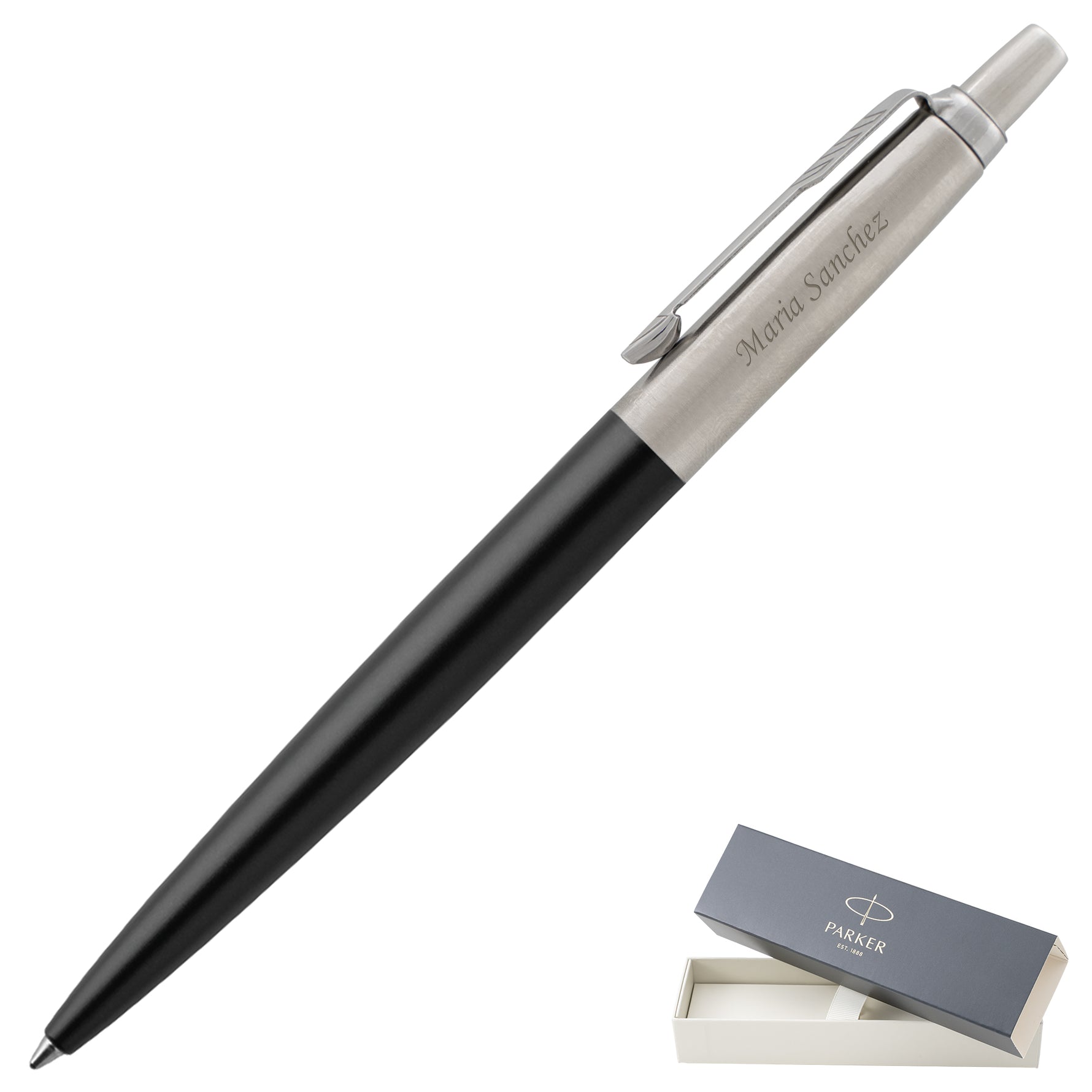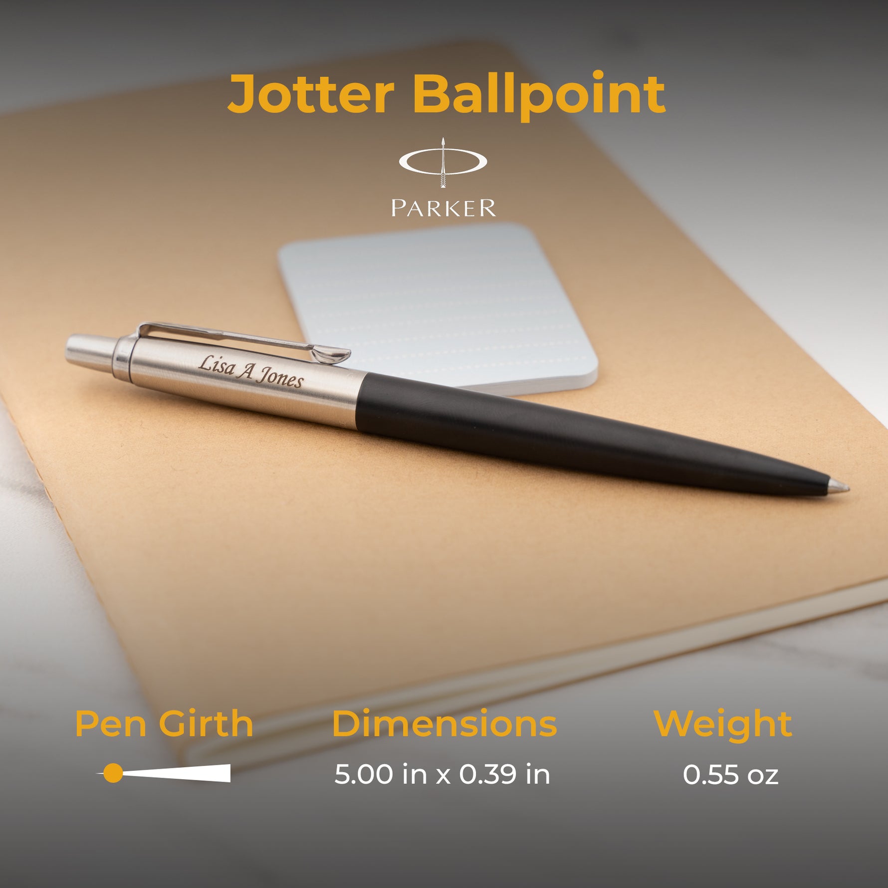 Your personalized Jotter arrives in an official Parker gift box with a pre-installed black gel ink cartridge that writes three times longer than standard ballpoint refills. The precision laser engraving creates a tone-on-tone effect that maintains the pen's professional appearance, making it particularly suitable as a graduation gift pen or daily writer for those who appreciate understated quality.