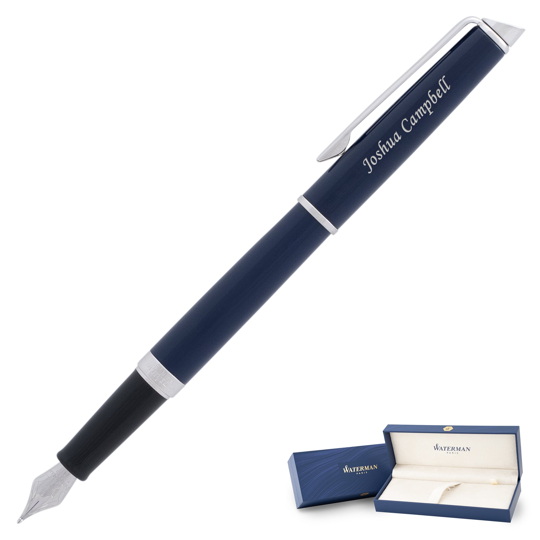 Each pen arrives ready to write with one Mysterious Blue ink cartridge installed and packaged in Waterman's signature blue presentation box. The optional personalization appears elegantly along the barrel, making it a thoughtful engraved keepsake gift backed by Waterman's comprehensive three-year international warranty.