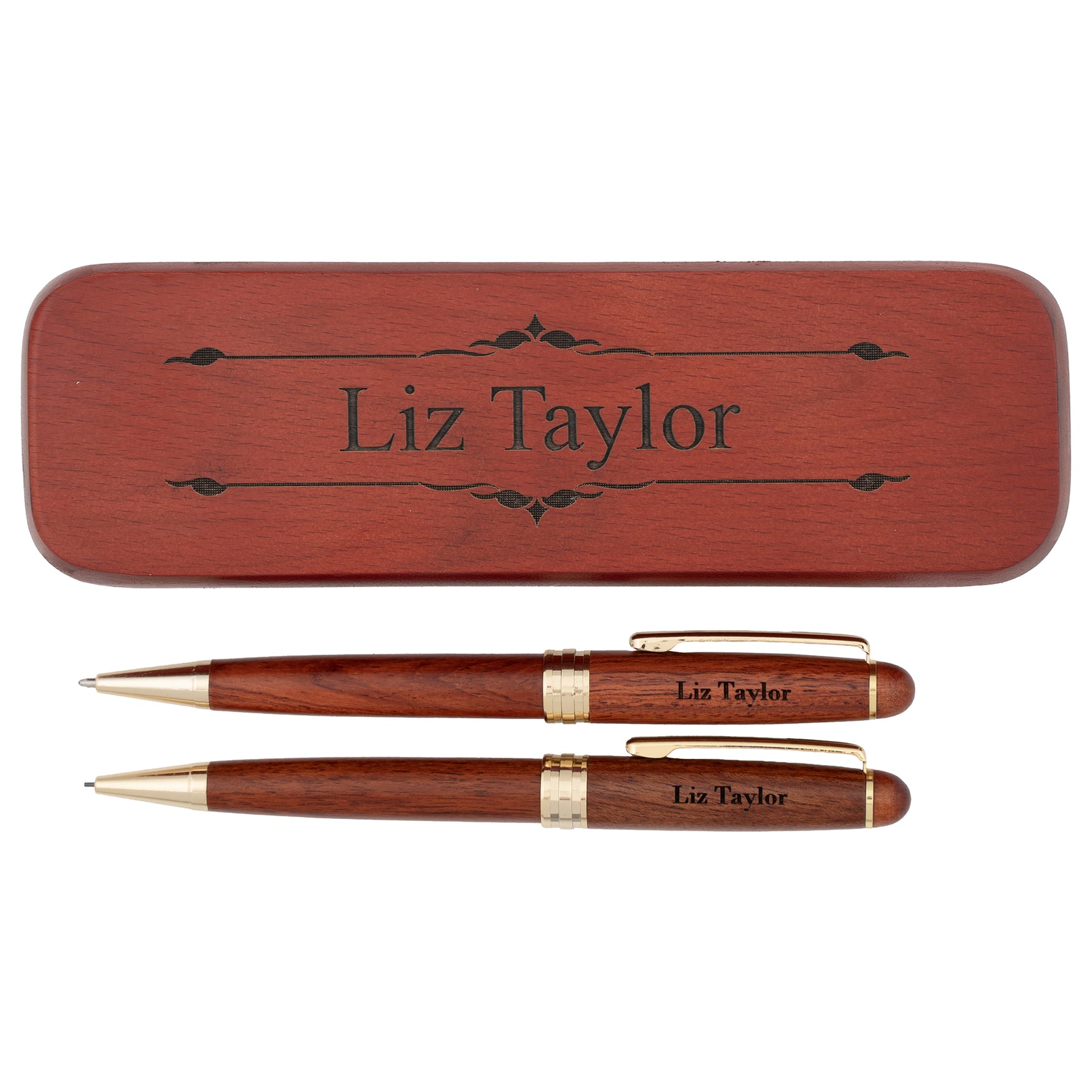 This Deluxe Rosewood Ballpoint and Pencil Set pairs a smooth-writing twist-action ballpoint with a precision 0.9mm mechanical pencil, both housed in hand-tooled rosewood barrels that showcase unique grain patterns under rich varnish. The gold-trimmed writing instruments provide reliable daily performance while the natural wood variations ensure no two sets are identical—making this pen and pencil set both functional and visually distinctive.
