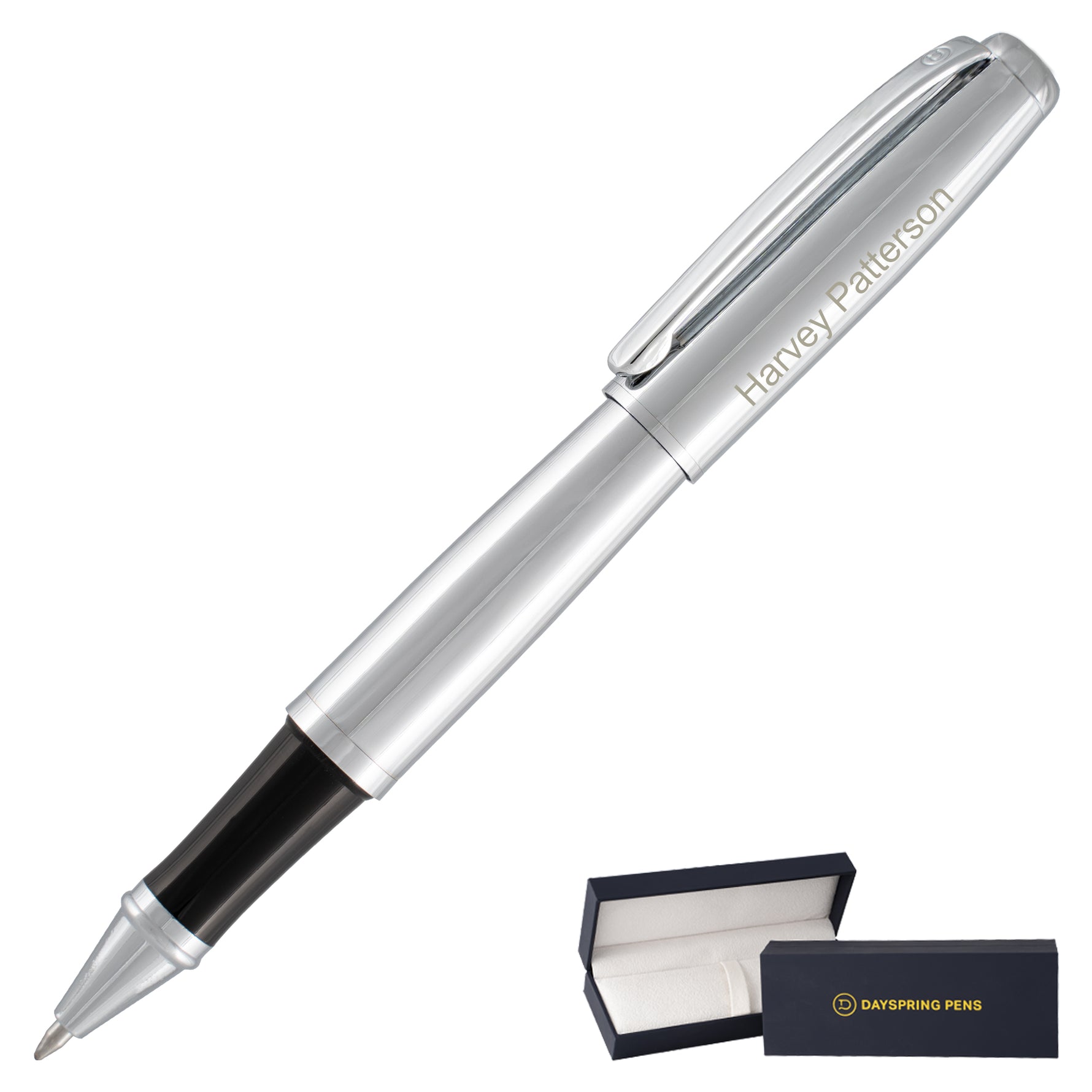 This medium-sized pen measures 5.5 inches when capped and 6.25 inches with cap posted, fitting comfortably in standard shirt pockets or portfolio slots. The lustrous chrome finish resists fingerprints and everyday scratches, while the permanent tone-on-tone engraving creates a subtle yet sophisticated personalization that won't fade or wear away. Each pen comes pre-loaded with premium black rollerball ink that writes for approximately 0.9 miles before requiring a standard international refill.