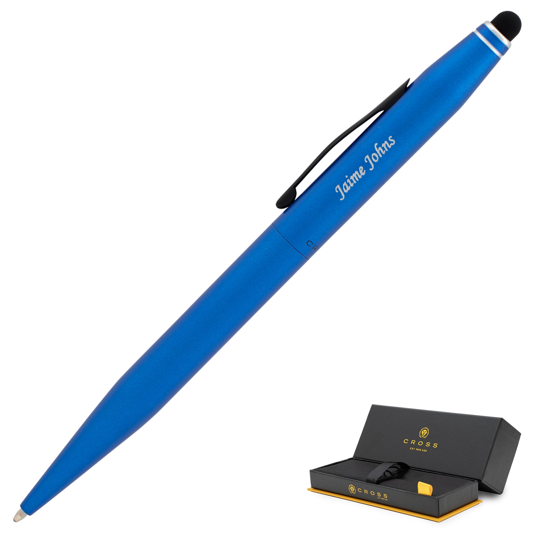 When custom engraved, the deep-cut personalization reveals a silver tone that stands out beautifully against the blue metallic finish. Each personalized pilot pen ships in a premium Cross gift box with documentation for the lifetime mechanical warranty, making it an ideal gift pen for teacher appreciation, tech professionals, or anyone working between digital and paper environments.