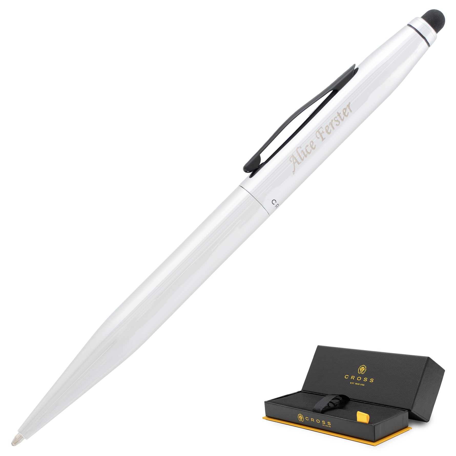 Each Tech2 arrives packaged in a premium Cross gift box with a pre-installed black medium-point ink cartridge. Custom engraving reveals a brass-toned personalization against the chrome finish, creating a distinctive appearance. Cross backs this custom stylus pen with their Lifetime Mechanical Warranty, ensuring reliable performance through years of daily use.