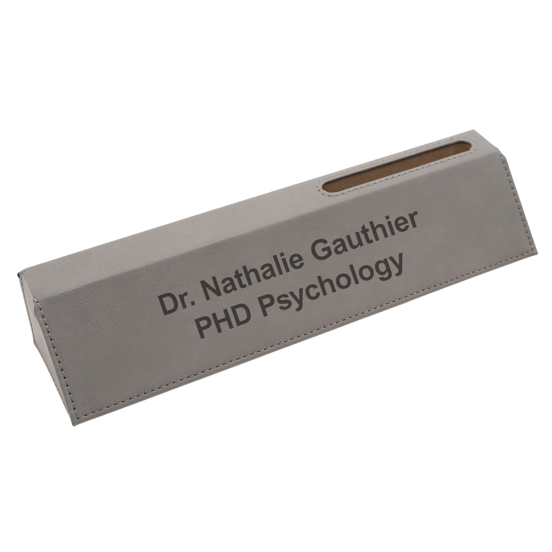 Laser engraving creates a permanent black imprint against the gray background, ensuring your name, title, or message remains clearly visible without fading or wearing away over time. The generous 10¼" × 2¼" engraving area accommodates multiple lines of text, making this engraved gift ideal for recognizing achievements, welcoming new team members, or establishing professional presence in shared workspaces.