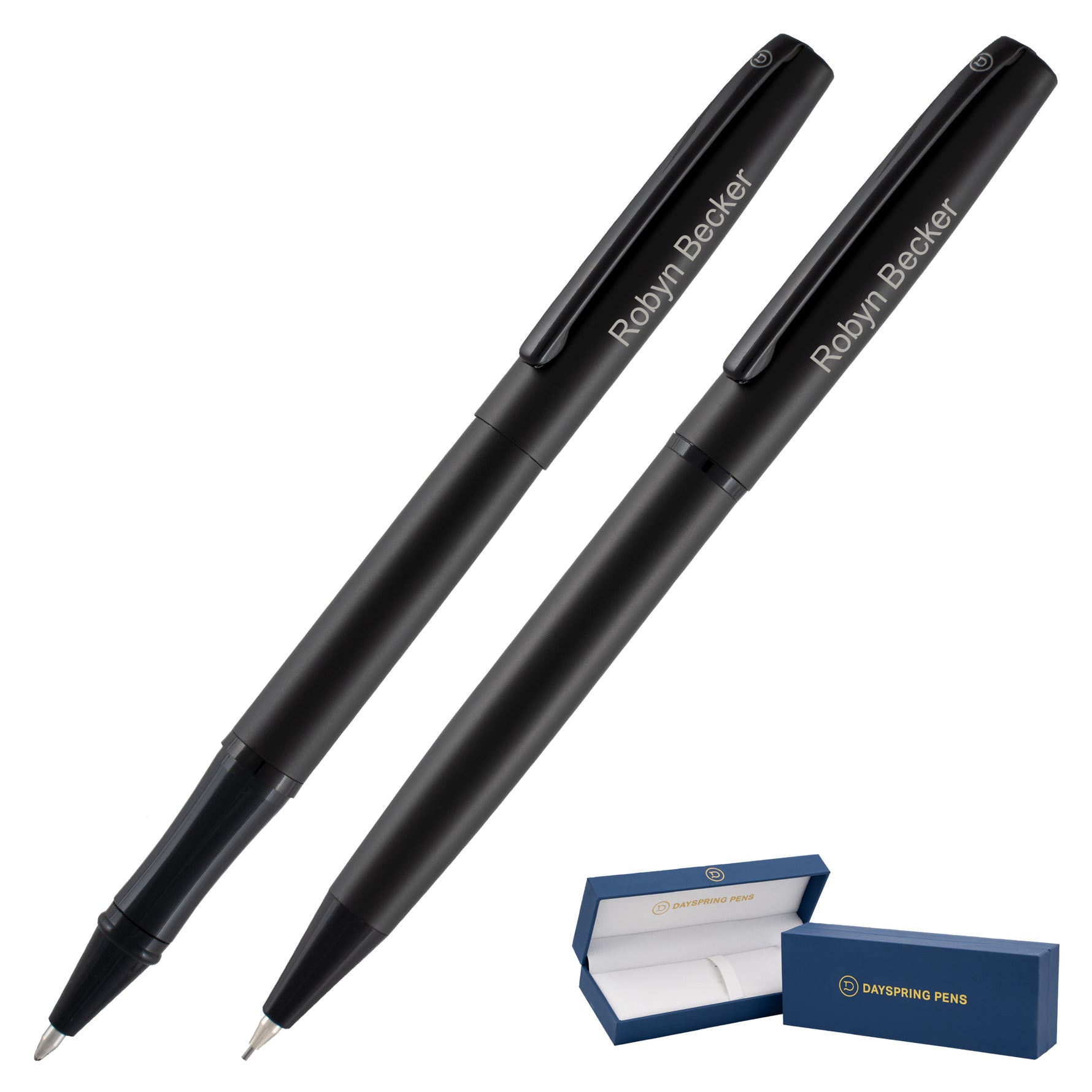 Each personalized rollerball pen set arrives in a premium Dayspring Pens gift box with custom laser engraving that reveals a silver contrast against the matte black finish. This presentation makes it particularly appropriate for professional milestones or educational achievements where a pen and pencil set serves both ceremonial significance and practical daily function.