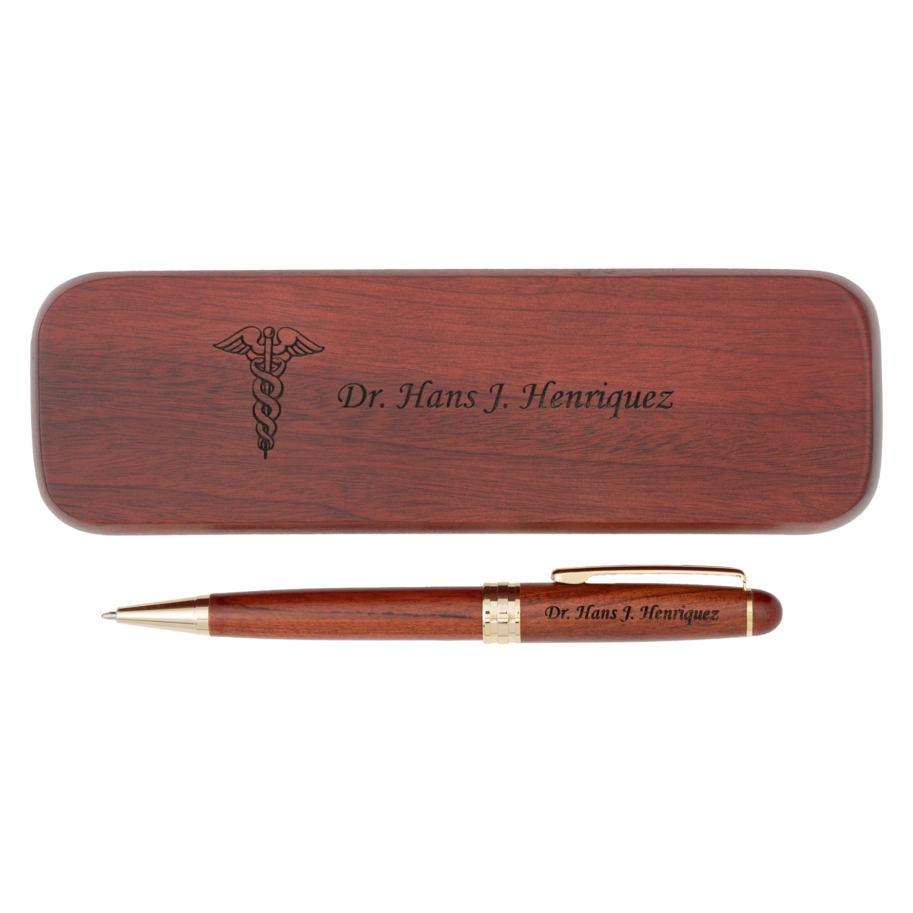 - Twist-action ballpoint pen and matching carved rosewood case with caduceus design